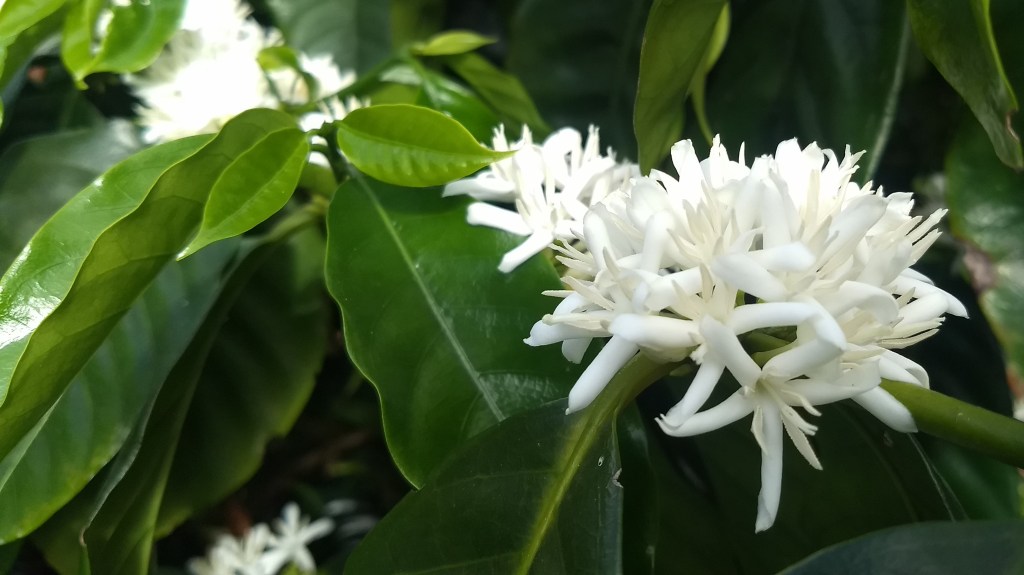 Growing, flowering, and fruit development: we keep the bushes at about five or six feet in height – which promotes fruit production, and means that we can reach the cherries to pick them. Bushes take about three to five years to start flowering and bearing fruit; flowering usually occurs from mid to late summer (February/March), beautiful and delicate white summer flowers surrounded by lush green shoots and growth. The mostly self-pollinate, and small green berries start to form, and develop over the winter. In late spring and early summer they start to ripen, and picking the ripe red cherries typically runs from November to around February. Flowers only form on new growth, so after picking we prune the bushes to encourage it, and to get rid of the vertical runners that otherwise form. If left to their own devices, coffee bushes will grow to 30 feet or more.