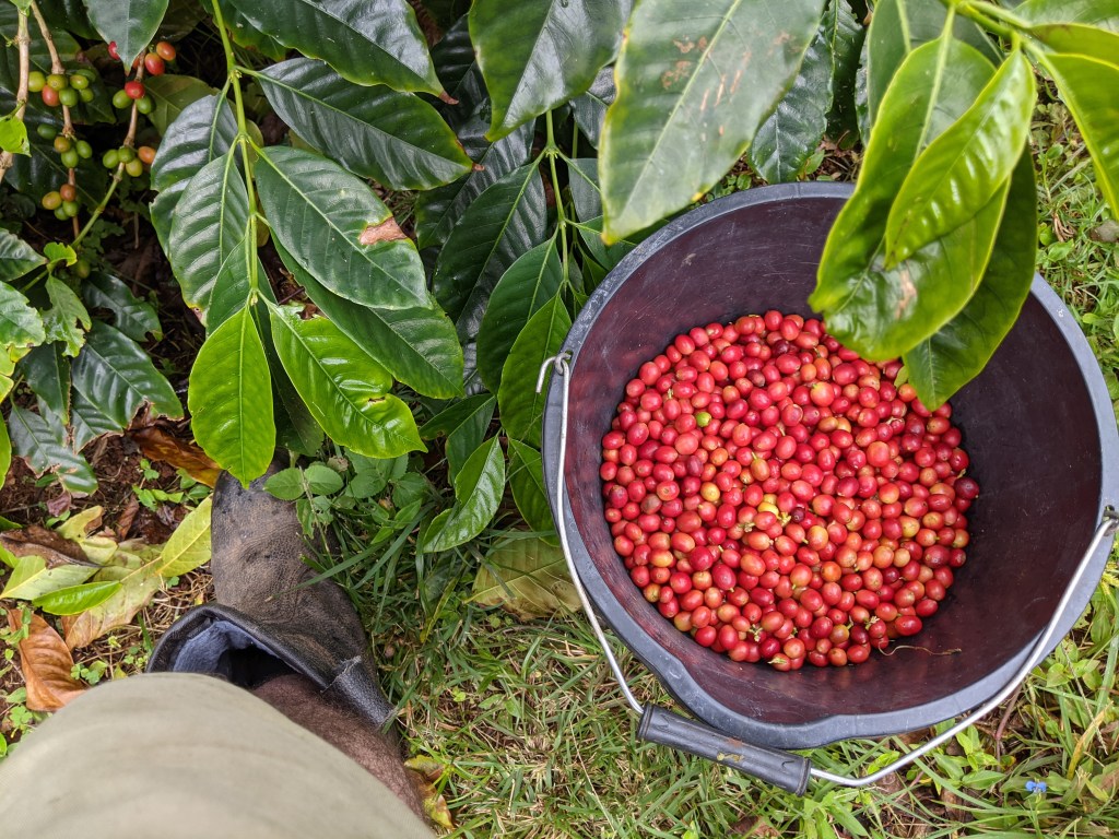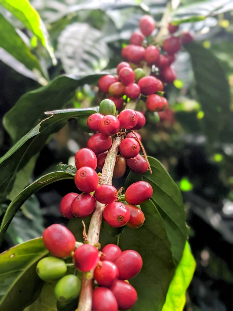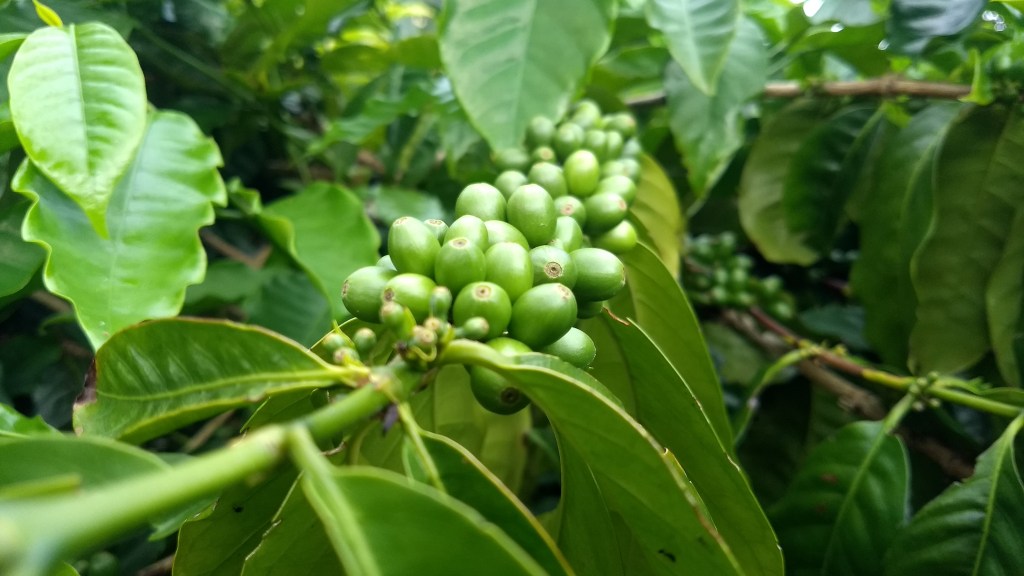 Coffee at Wranghams: when we bought the property in 2014 we discovered an overgrown coffee plantation – only around 30 bushes had survived, which we pruned back and cultivated, and then planted around 350 more from the saplings that had grown at the base of the existing plants . Wranghams is about 520 metres above sea level, which is quite low for Bourbon Arabica, but the mild climate of around 15-25 celsius, the volcanic soil, and the high levels of rainfall, all combine to make it an ideal growing environment.