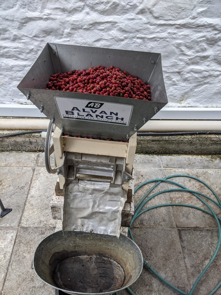 Picking and pulping: once the season starts, coffee picking by hand takes place daily. It’s important to only pick the cherries that are ‘post-box’ red, and they only stay that colour for a few days. After picking, the berries are pulped – which means mechanically removing the red cherry skins using a hand pulping machine to gently squeeze the cherries and scrape the skins off. Skins are not wasted, we compost them for the garden.